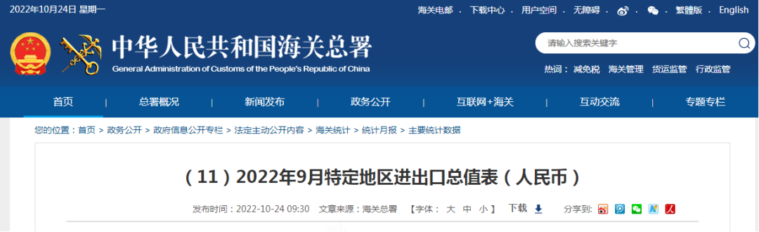 圖1 2022年10月24日,海關總署官網公布了9月份特定地區進出口總值表,在全國85家保稅物流中心中,山西方略保稅物流中心(B型)排名升至第44位